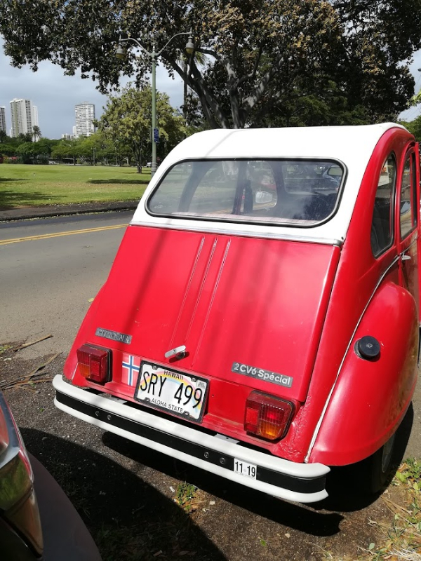 Je vois que la jupe arrière de la 2 CV d'Hawaï (avec un drapeau norvégien !) rouille autant à Honolulu qu'en France :lol: