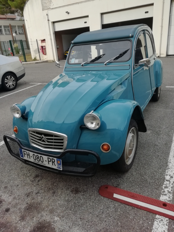 Une 2cv du Sud aura forcément plus de chance d'être saine, que nos belles du nord !!! Elle semble bien gardée ta demoiselle, vu les véhicules bleus foncés avec des bandes réfléchissantes dans le garage à l'arrière plan...par les temps qui courent, il y en a déjà beaucoup trop qui "prennent des ailes"...Bonne roulade Alex !!!