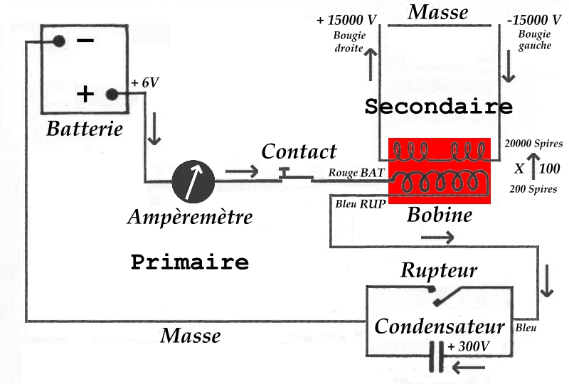 Explication du fonctionnement de la bobine , le courant primaire de la bobine circule du plus au moins.
