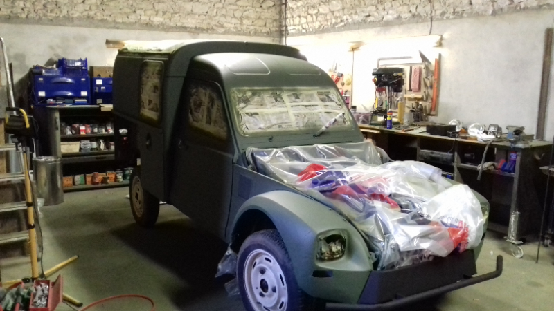Démontage du superflus, ponçage ,masquage des vitres et peinture à la bombe mat . Cette Acadiane est destinée aux tous chemins donc pas besoin d'une belle peinture même si je suis content du résultat (auto satisfaction) :laughing: