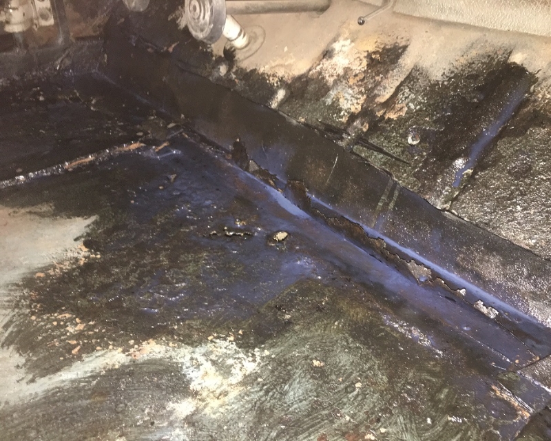 Je remplacerai l'année prochaine les deux planchers latéraux et la partie basse avant. En attendant, élimination des tôles pourries, traitement anti corrosion, peinture minium et noire et pose d'un plancher provisoir. Pour l'étanchéité extérieure, mastic et Blaxon.