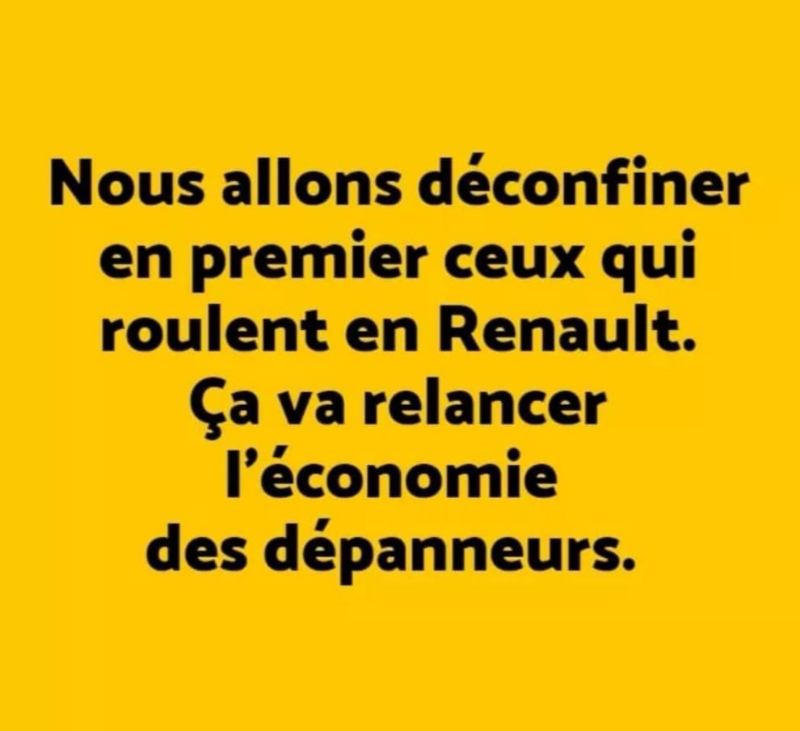 CHARLYSTONE a écrit :Bonjour ,vous êtes mauvaise langue, une Renault ne tombe en panne que lorsque elle roule perso j'ai une twingo (de la grand mère ) en panne, la clio 2 de ma fille, en panne ,mais la clio3 de ma femme ça va elle roule pas puisque elle chome jusqu'au 11 mai,