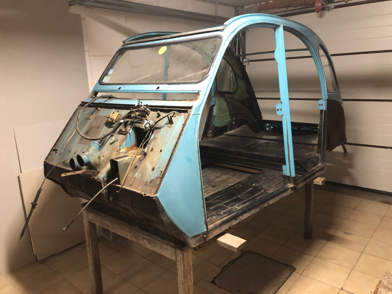Le démontage le la belle s'est fait avec de nombreuses photos, un marquage des câbles électriques et repérage de l'endroit ou ils passent. Du côté technique, je n'ai aucune assurance que le moteur fonctionne mais il ne devrait pas y avoir de raison (bien que le moteur des 2CV4 présente une faiblesse). Côté environnement moteur, échappement, roulage, suspension, il y aura du travail mais je reste zen pour l'instant. :cafe: