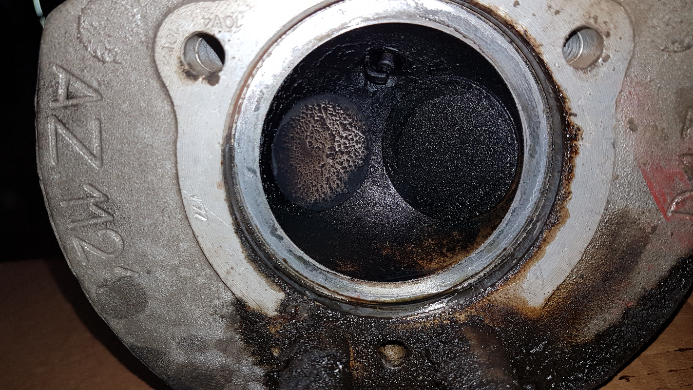 Sur la culasse côté conducteur, si tu regardes bien la photo il y a même de l'huile non brûlée. Comment a t-elle pu arriver là ? Car il y a véritablement un écoulement d'huile sur les chemises, plus marqué comme conducteur. Ça fait une "pâte" cuite par la chaleur du moteur, j'en ai troué plein les tôles de refroidissement.
