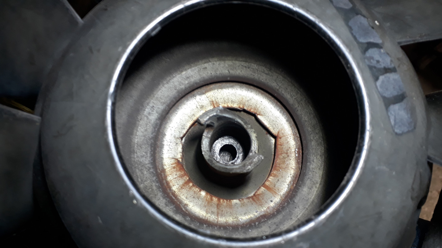 Une surprise de derrière les fagots ! Pour la vérification de l'allumage, je démonte grille et ventilo. Quelle surprise de devoir prendre quasi 1 heure pour extraire le ventilo ! J'ai tout fait, tapoter la clé de 14 dans le logement pour débloquer, chauffer au soufflant, extracteur à griffes avec fabrication d'un axe d'appui dans le vilo, huile de coude et réflexion ... Bref, le ventilo se débloque et je le découvre fendu et légèrement faussé sur son axe
