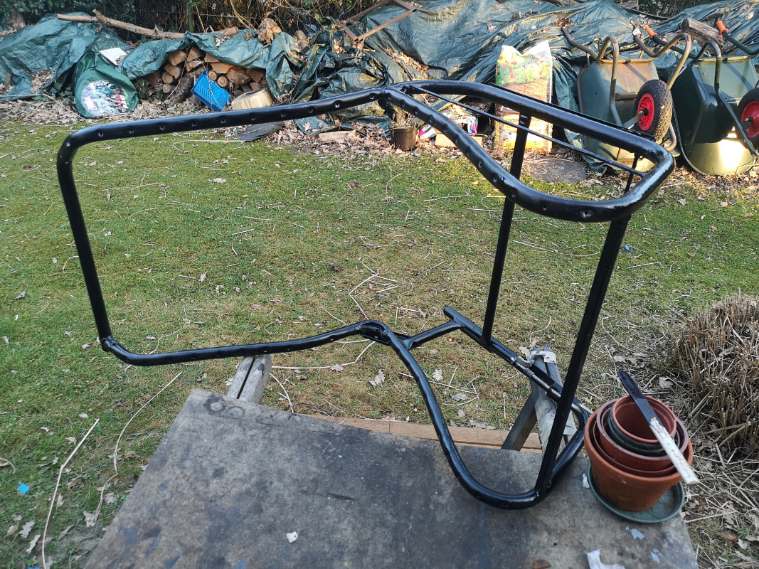 J'ai ressoudé le rail qui était fêlé. C'est pas beau... J'ai donné un coup de meuleuse, heureusement le cordon est "plein". On remet une couche de noir antirouille.... Je ne sais pas si la méthode est bonne, mais j'ai percé l'assise du siège au tournevis, pour passer les crochets dans le tissu (ils sont appuyés sur les armatures dans le tissu). Assise et dossier faits. Vient ensuite la mousse, collée à la néoprène:
