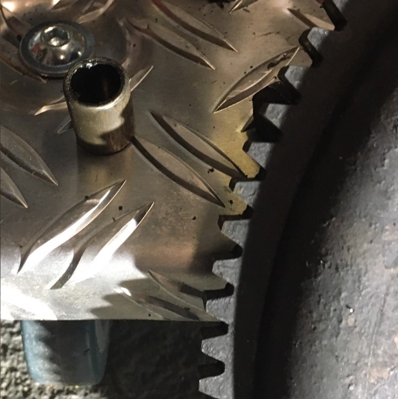Et là surprise ! J'ai retrouvé la bague bronze du démarreur manquante, coincé entre le volant moteur et le carter : J'avais un bruit strident dans les tours depuis peu, preuve avec la trace laissée sur le volant moteur.