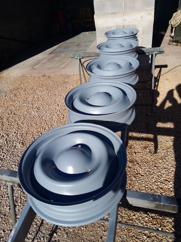 mise en apprêt phosphatant des 5 jantes revenu de sablage + passage au rustol du châssis ( je ferai des photos de la dentelle a remplacer ) ..