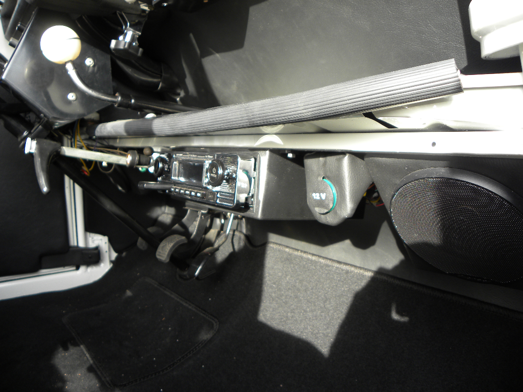 Passage d'un 12v (allume cigare) sur support maison et autoradio type "vintage" avec 4 enceintes (2 avant avec supports fait maison sous tablier, et deux sous sièges arrières avec supports aussi maison)...