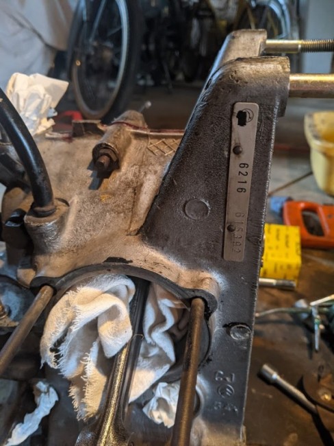 J'avais remarqué que le moteur n'était pas pourvu de la plaque habituelle, voilà ce qu'on a : En sortant les cylindres, j'ai vu qu'une cale était présente sous les cylindres, d'une épaisseur de 0.5mm : Je n'ai pas réussi à trouver de renseignement sur cette cale, c'est mentionné sur aucune doc technique, schéma ou autre.