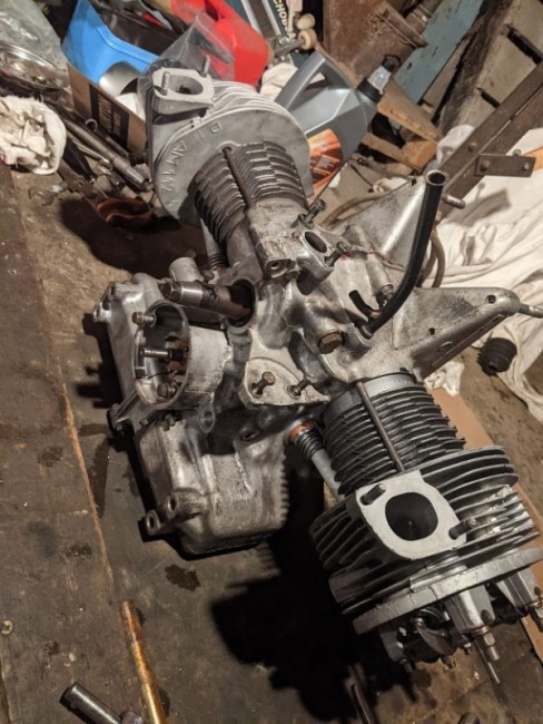 Voilà, je remonterais le reste quand le bloc sera sur le châssis pour de pas risquer d'arracher quelque chose en le manipulant. J'ai aussi volontairement laissé le conduit de graissage des culasses à l'air pour contrôler que l'amorçage du circuit d'huile s'est fait correctement.