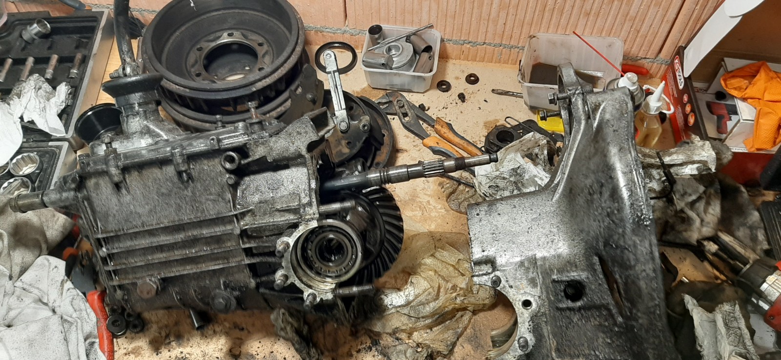Donc démontage de l'ensemble moteur/boite, qui avait grand besoin de nettoyage, pour commencer!