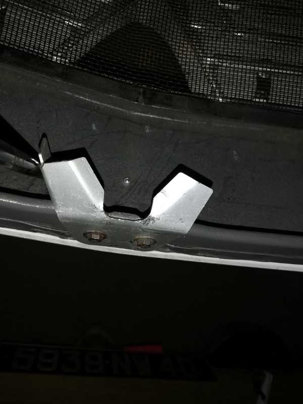 Donc sa grille ne devait tenir par les 2 vis du haut uniquement. Mais après avoir remis cette barre manquante (et donc la 3ème vis !), il n'arrive plus à fermer le capot, car le crochet étant bloqué par la barre (que l'on voit sur la photo !), il ne "s'ouvre" plus suffisamment pour laisser passer le loquet de fermeture du capot.