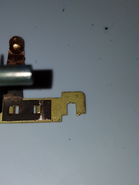Pour le linguet, j'ai trouvé une lamelle de contact en cuivre, que j'ai soudée à l'étain puis découpée pour réparer le contact.