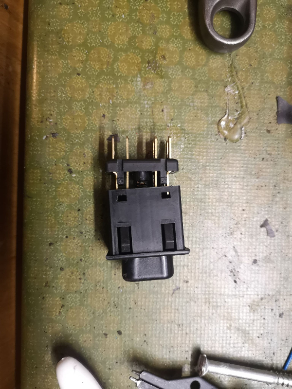 Petit truc que j'ai fait sur ce tableau, et qui pourrait servir pour d'autres: j'avais un souci avec mon interrupteur de feux de détresse: soit il ne se tenait pas enfoncé, soit il restait coincé. Je l'ai donc ouvert (assez facile à faire en poussant délicatement les encoches dans le bas du boîtier): La construction est typique de ce type d'interrupteur à deux positions: des contacts mobiles qui ferment le circuit, un ressort, et une petite tige métallique qui passe sur un "circuit" en plastique, dont le trajet permet de bloquer le bouton en position enfoncée à la première pression, et à le relâcher à la seconde pression. Une chouette invention quand on y pense! Le souci ici, c'est que la came présente dans ce "circuit" en plastique s'est complètement usée et ne retient plus correctement la tige. Ma solution? Un fer à souder à 200-220°C (histoire de fondre le plastique - ABS à mon avis - , pas de le brûler), et reformer tout doucement cette petite épaisseur qui bloque la tige. Faut vraiment y aller mollo, et pousser la matière sans passer au travers. On remet le ressort et on engage la tige, avant de refermer le tout... Et ça marche! J'espère que ça tiendra le coup, on verra à l'usage