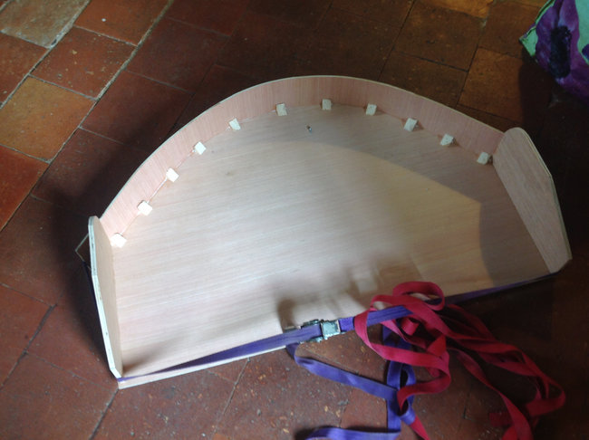 Pour la partie arrondie je me suis fait un gabarit en carton : je pose le carton a plat sur la partie arrondie de la caisse et je tappe doucement sur le carton tout le long de l'arrondi avec un maillet. ça marque le carton et il n'y a plus qu'a decouper...