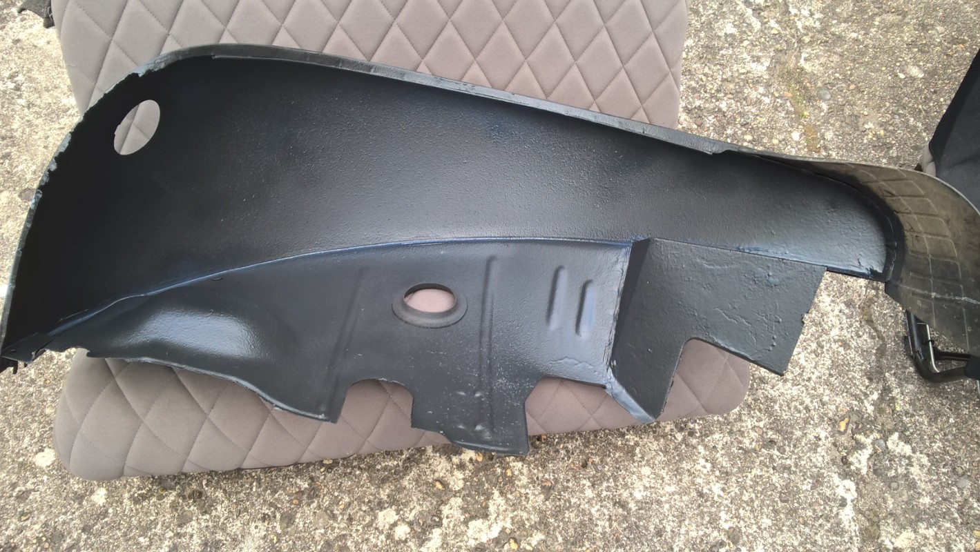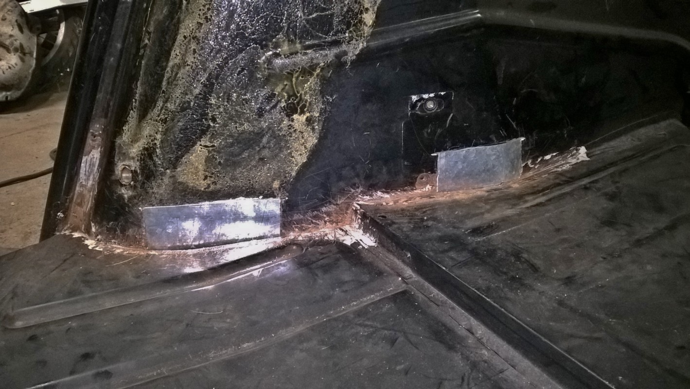 Pour le moment les rustines ne sont que positionnées. J'ai retiré le maximum de rouille et j'ai injecté comme j'ai pu avec un vaporisateur manuel et un petit tuyau du convertisseur de rouille entre les tôles.