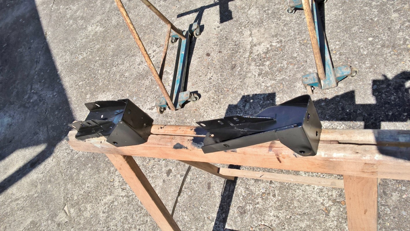 En même temps que le travaille sur la rouille de la caisse dans le garage, j'ai profité du beau temps et des température plus douces pour finir la seconde couche de peinture du châssis et des petites pièces en extérieur.