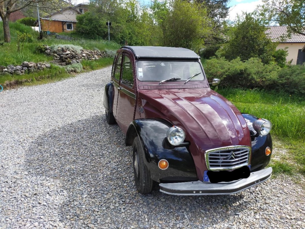 Je viens de faire l'acquisition d'une 2 CV 6 AZKA de 1982, initialement bleue, mais repeinte en fausse Charleston par le propriétaire précédent.