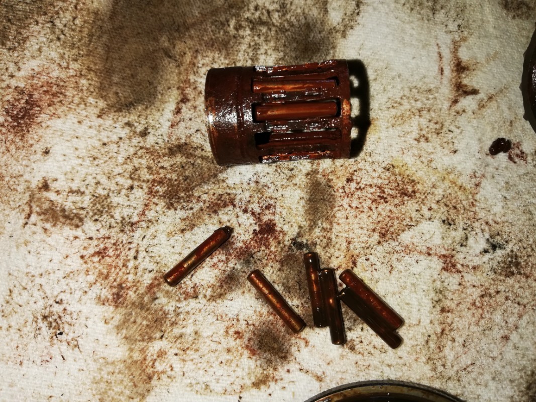 :celle interne à l'arbre de commande et celle du pignon d'attaque : du coup je pense changer aussi les deux autres cages à aiguilles même si elles me paraissent correctes...Au niveau des roulements rien à dire, je les conserve en l'état, par contre je vais devoir changer les segments de ralenti, on voit bien le marquage de l'usure : et voilà l'ensemble sorti : il me manque un ressort que j'ai trouvé cassé, je ne sais pas si ça se trouve chez nos revendeurs habituels ? Dernier point savez vous comment et avec quel outil il faut sortir les roulements de différentiel ?