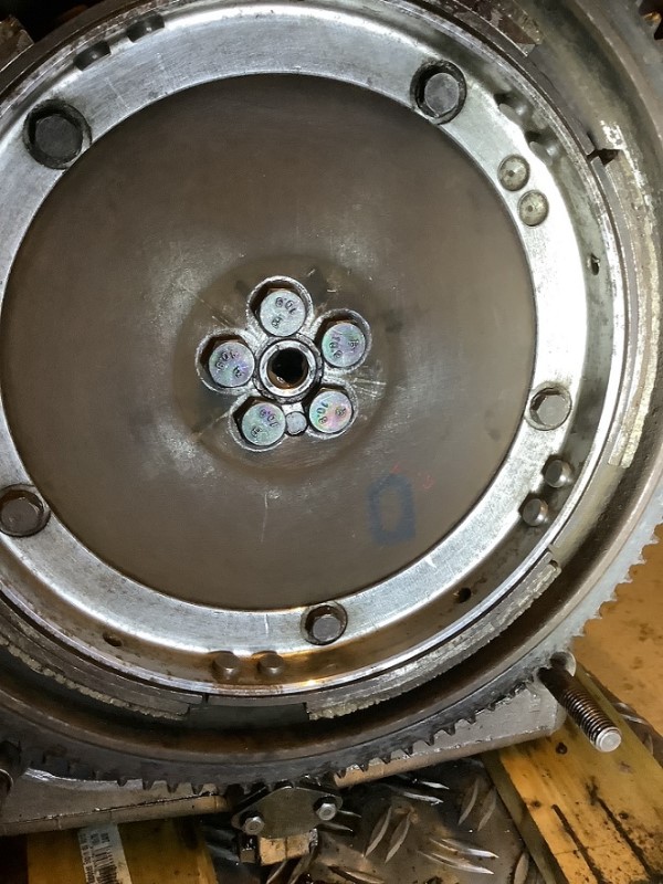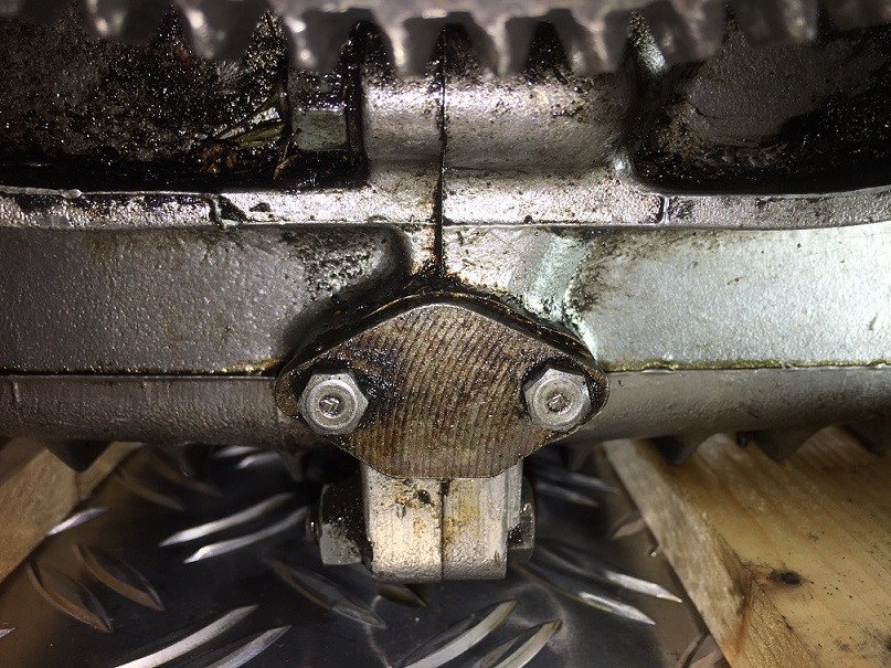 Déboulonnage des deux vis des supports avant du moteur, pose d'une chandelle sous la boite de vitesse après avoir levé l'ensemble par un cric. Déboulonnage des 4 vis M17 : un conseil, les deux vis du dessus, pas de soucis, les deux du dessous, il n'y a pas de place, clé à œillet de 17 Facom, c'est top ! Après il faut soulever l'ensemble et après tirer le moteur quand les vis de fixations des supports moteurs sont bien au dessus du longeron avant du châssis, sinon ça coince ! Le moteur se retire facilement à deux (66 kg) et voici le résultat :