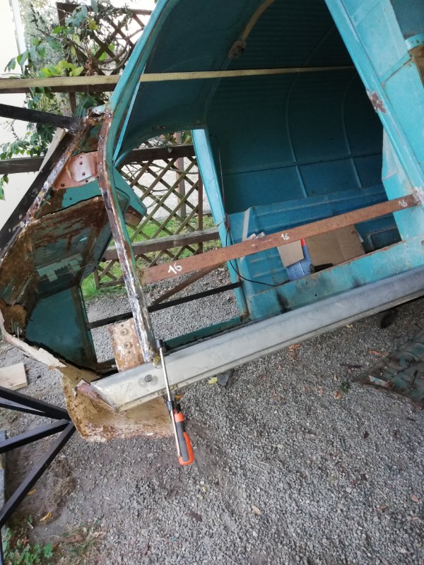 Je découvre quand même que ma fourgonnette est passablement fatiguée, et la rouille perforante s'est frayée bien des chemins : sur le montant de portière à l'avant par exemple, mais aussi sur la tôle du tablier à la jonction avec l'auvent latéral et au niveau de la gouttière qu'il m'a fallu amputer de 50cms dans le bas... : c'est pas trop méchant à mon avis , ça va demander des renforts et des soudures...