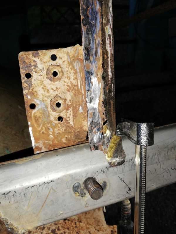 Enfin, ici, on voit pas trop bien mais la tôle du tablier qui est soudée à l'auvent gauche est aussi perforée; il faudra que je remette de la tôle neuve...