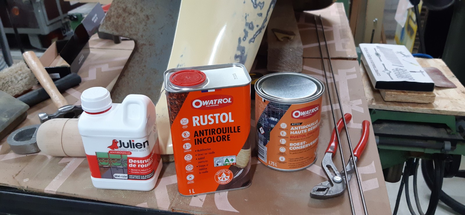 J'ai donc : de l'acide phosphorique pour dissoudre la rouille à nu, l'Owatrol pour traiter les zones inaccessible et le Rustol CIP pour faire une sous-couche antirouille.