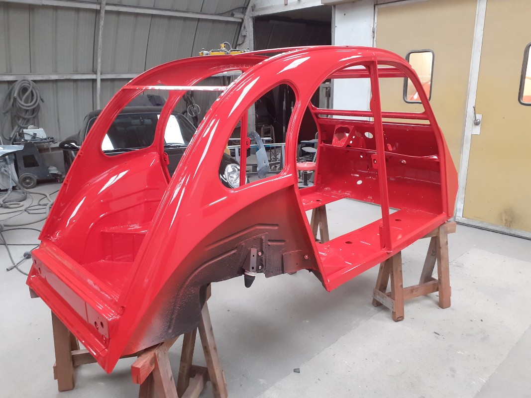 Changement du plancher pédale et du plancher gauche puis sablage et apprêt époxy de la coque suivis de la préparation carrosserie de l'ensemble des éléments, apprêt et peinture (Rouge Vallelunga) de l'ensemble.