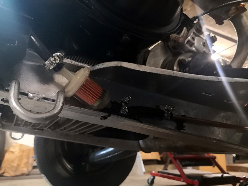 Ensuite, j'ai remis le moteur, agrès avoir bien entendu changé la butée d'embrayage et graissé légèrement le bout de l'arbre primaire qui rentre dans le vilebrequin. J'ai également remis les boites de chauffage et le pot sous boite de vitesses en utilisant des colliers façon Burton. J'ai créé, à l'aide d'une tôle d'aluminium de 2 mm qui j'ai dans mon fourbis, un déflecteur pour éviter que le câble de frein à main gauche ne touche la boite de chauffage. Et j'ai fini ma journée de travail en installant le filtre à essence à sa place (au niveau du châssis, bien avant la pompe à essence, l'alternateur (sans sa courroie, voir plus loin) et la boite à air. Et j'ai mis tout ça dans son carton, en attente de la suite. Je pense que la première question qui va être posé sera :