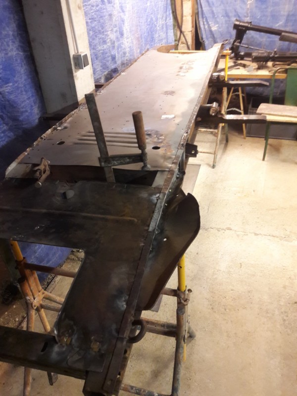 Donc le châssis ressemble à un mannequin anorexique avec les cotes et les ischions qui passent au travers, mais c'est moins pire que je le pensais. Je sais qu'il aurait fallu bouchonner au tig ou mig, mais j'y ai pas accès. J'aurais cependant dû commencer le travail par le centre et "tourner" pour que les dilatations se fassent au max vers l'extérieur. Moi, comme un blaireau, j'ai commencé par le tour pour enfermer une belle poche de tôle au milieu, qu'il a fallu contraindre pour la souder aux renforts centraux.