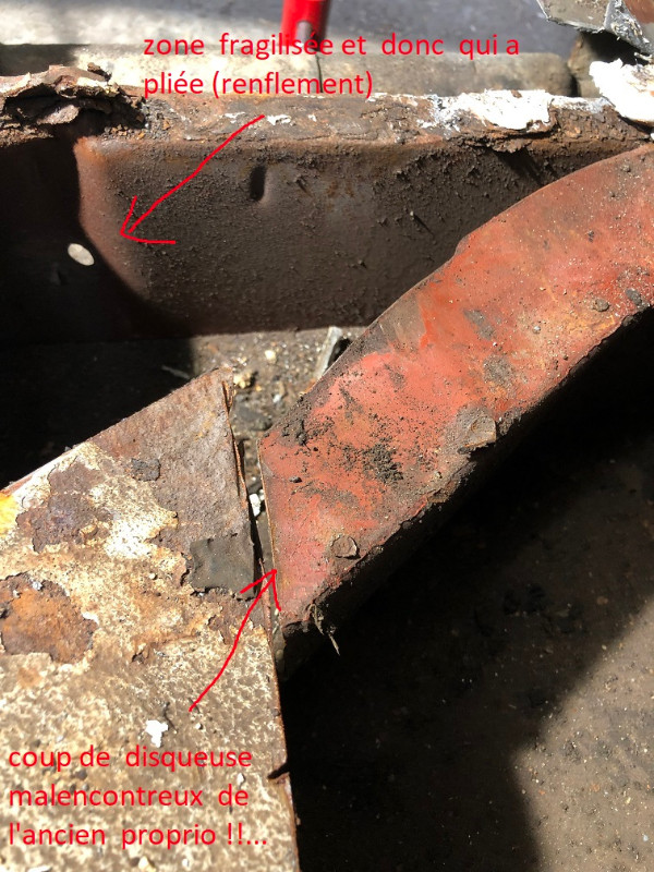 donc en résumé le chassi a ete mortelement disqué et les toles plancher chassis : pas rebouchonnées , puis le plancher pedale pas ressoudé mais collé au silicone