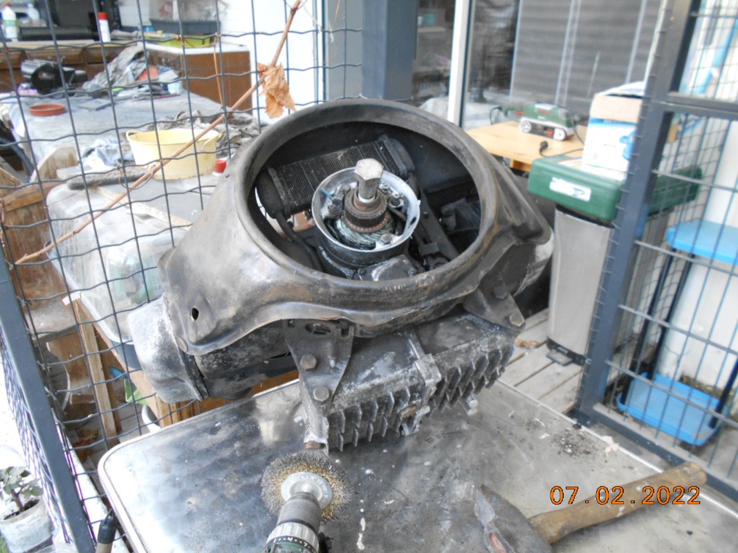 Mon second moteur (qui servira à fournir le chemise/piston d'époque, puis de base au 500cc) a été nettoyé direct à la brosse métallique sur perceuse, cela permet d'enlever des gros morceaux de matière sèche, puis les éléments ont été démontés et nettoyés au fur et à mesure. C'est je pense plus pratique et l'on en met moins partout.