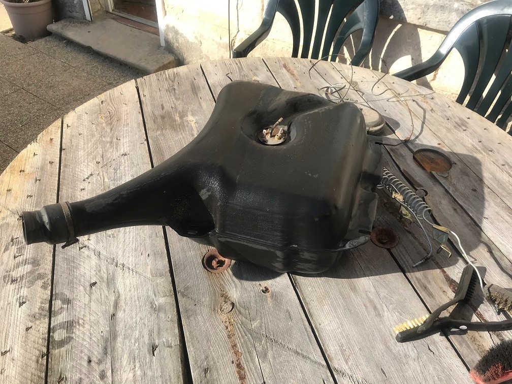 Je gagne la 2nd bataille! Voilà tout est sorti: J'en profite pour récurer le réservoir ainsi que toutes les pièces, visseries, quincaillerie démontées pour cette étape. J'ai refait une beauté au répartiteur (décapage + peinture) J'ai pu commander cette semaine chez Burton les pièces qui m'ont été préconisées