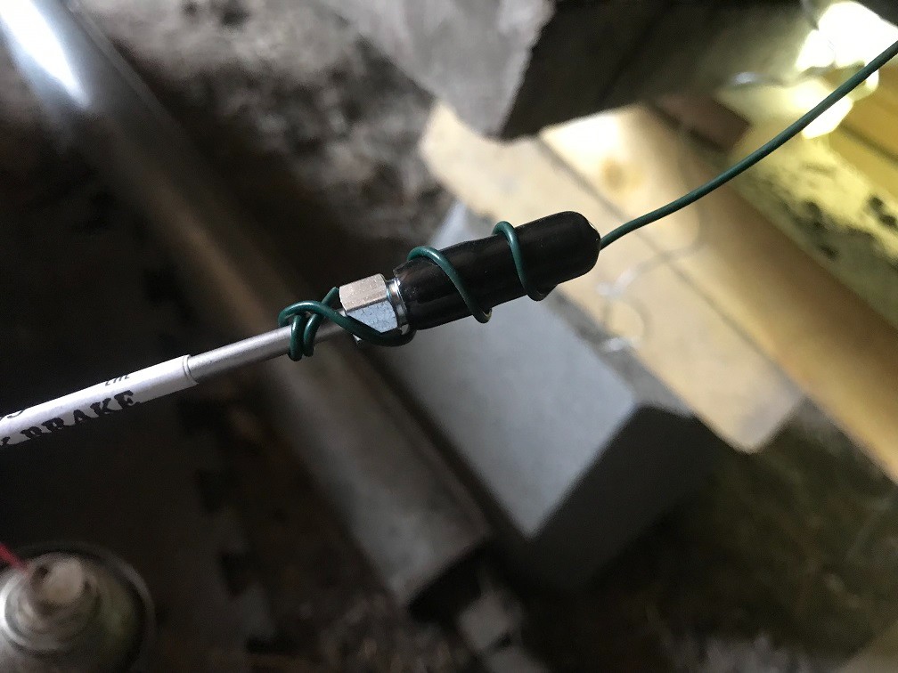 J'ai passé un fil de fer (et un fil souple au cas où) pour récupérer la canalisation en sortie: Il ne reste plus qu'a pousser et tirer la canalisation jusqu’à sa place finale, récupérer la vis et serrer: Viens ensuite la mise en place du cache, là c'était sport! Le cache a des encoches pour faire passer la canalisation et la plaque de blocage de la canalisation en bout d'essieu.