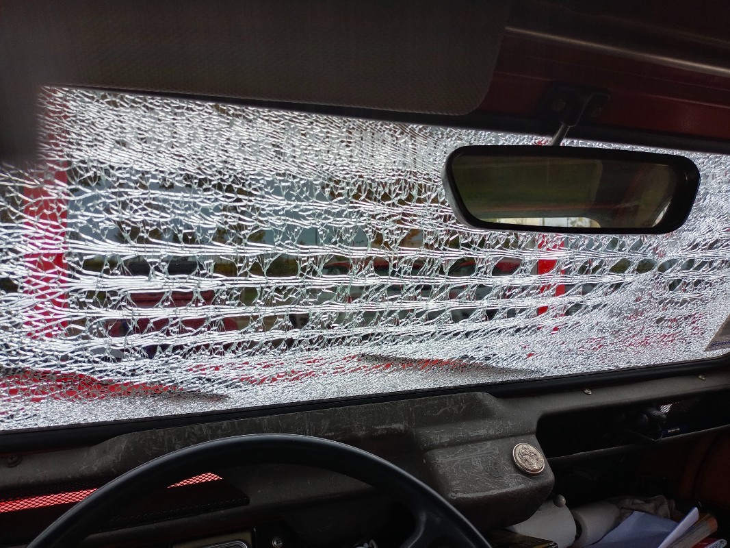 Je me suis mis des lunettes de soleil, pour le cas où ça aurait pété en route. Du ruban adhésif large transparent aurait été bienvenu pour assurer. J'ai roulé TRÈS lentement, maxi 60. À St Dizier, quand je suivais la 2cv blanche de Jacky, il m'a fallu appuyer un peu et je voyais ma vitre qui «rentrait» à cause de la pression, et j'ai appuyé une main contre. Ça a tenu.