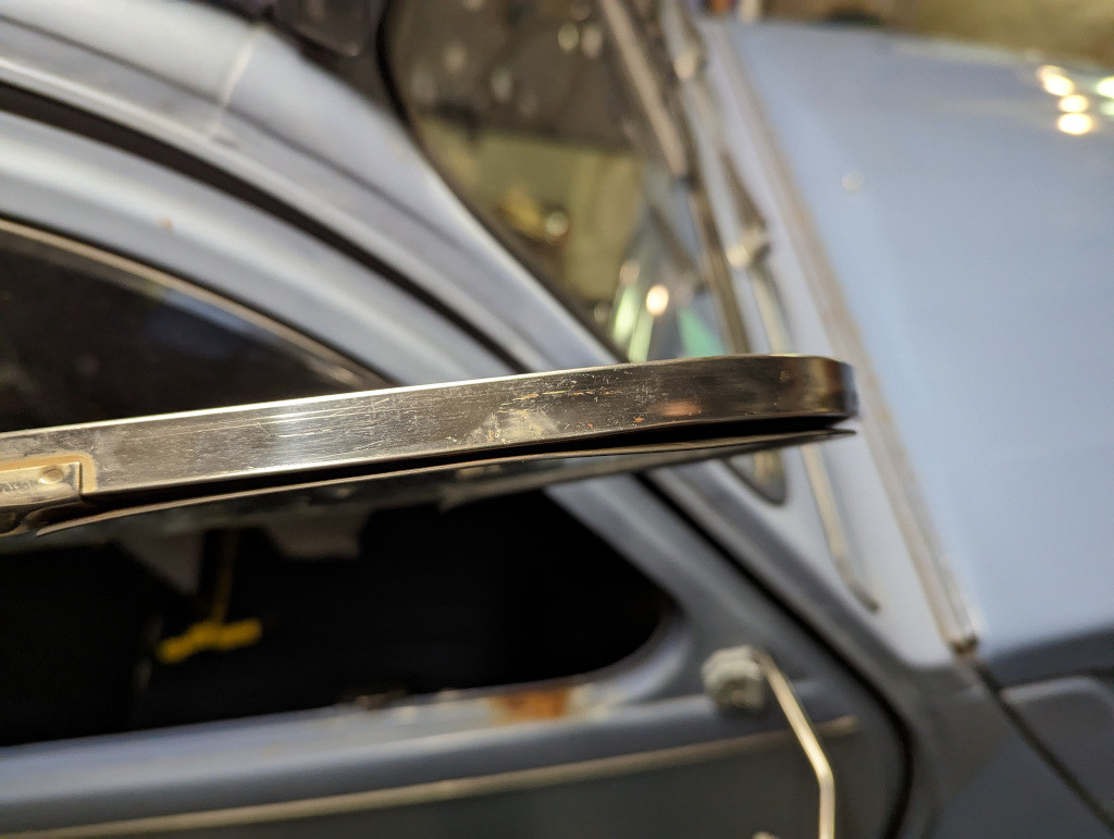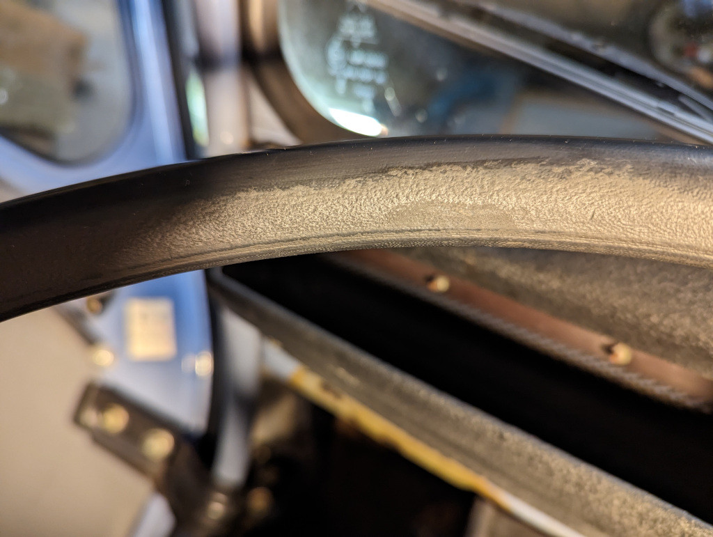 Avec une éponge grattante douce, puis au Dremel + brosse à poils de laiton, j'ai presque tout éliminé l'oxydation sur le cadre de la vitre :