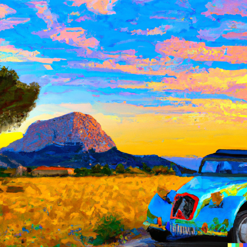 Peur du titre? Non vous ne verrez pas sur ce post les images (horribles) d’une 2CV passée au concasseur mais plutôt une 2CV passée dans la moulinette de l’intelligence artificielle. Quand l’intelligence artificielle et la 2CV se rencontrent, ça peut donner ça par exemple. Ma demande était: une 2CV Charleston peinte par Salvador Dali. Un des résultats est pas mal je trouve.