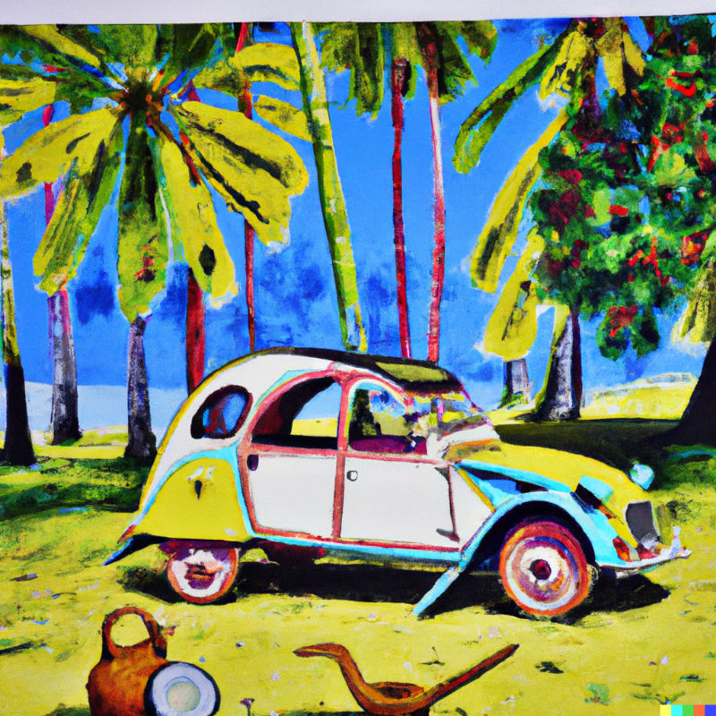 Paul Gauguin painting of a Citroën 2cv under coconut trees on Tahiti island