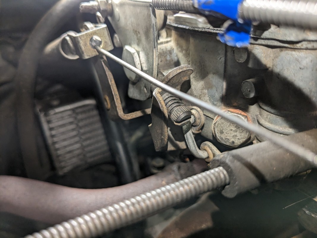 Il doit être bloqué a 2 endroit sur ton carburateur le premier collier tiens la gaine et le deuxième celui vers l'avant de ton carburateur "l'âme" de ton câble.