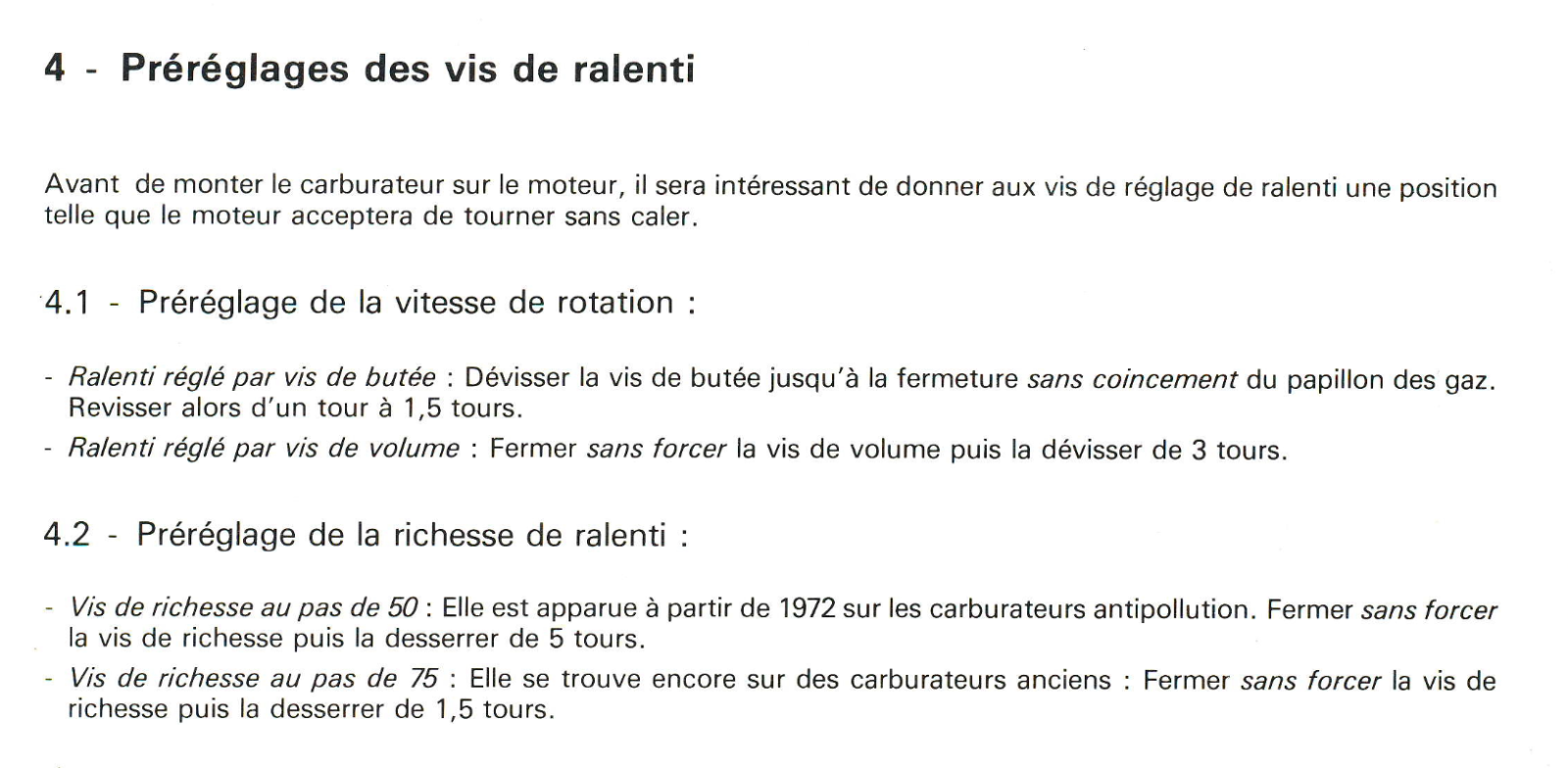 2 - ton ralenti tient alors que ta vis de richesse est fermée à fond et ce n'est pas toi qui a réglé le ralenti. Il y a de très fortes chances que ton ralenti tient par un papillon 1er corps suffisamment ouvert..