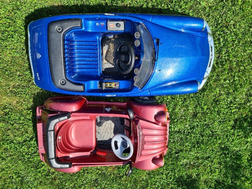 Avec beaucoup de retard voici les photos demandées de ma DS et ma 2CV Toys-Toys électriques. Vous remarquerez la différence de longueur des deux voitures, mon fils de 4 ans rentre encore dedans mais dans 2 ans il sera trop grand.