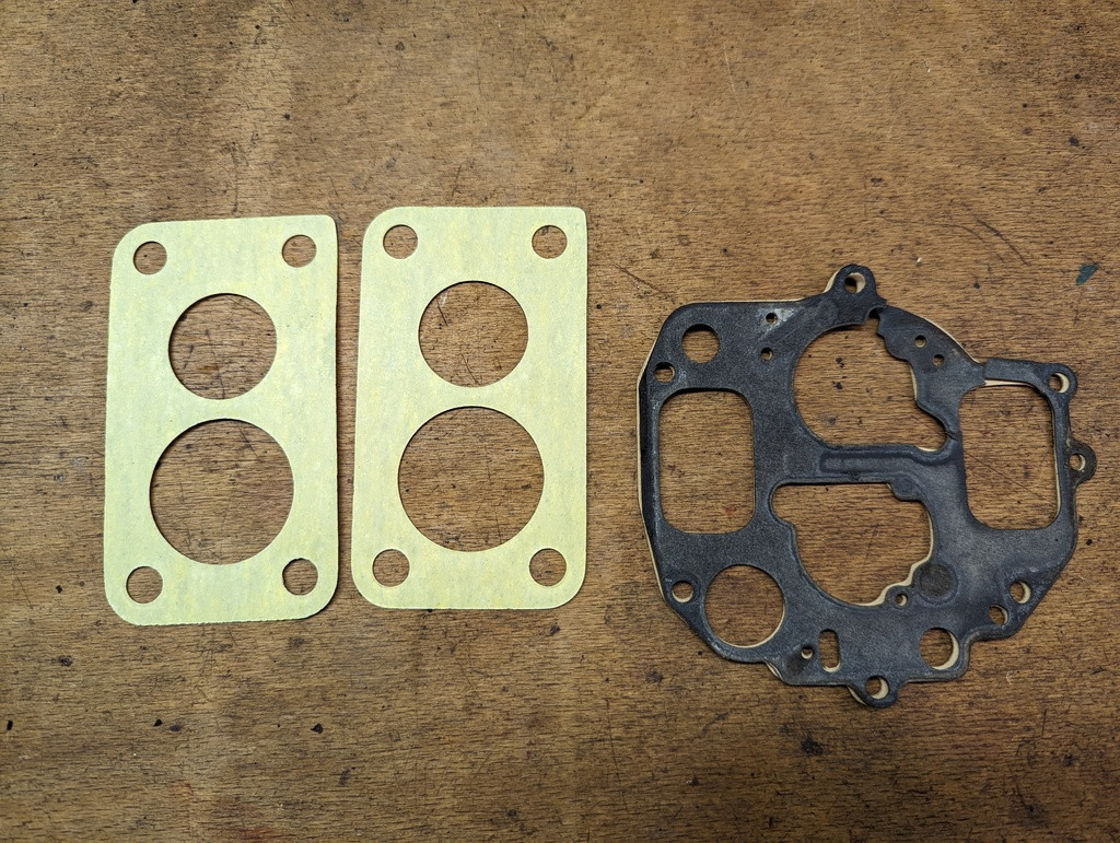 Pour les 2 joints à gauche sur la photo, je pense qu'ils doivent aller d'une part entre le corps du carbu et la cale thermique, et d'autre part entre la cale thermique et la pipe d'admission.