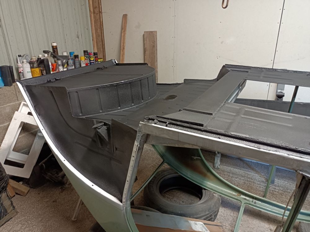 aprés avoir fait tous les joints de caisse, traitement anticorrosion sur les points de soudures et autres, pose d'un apprêt antirouille et protection antigravillon en dessous :