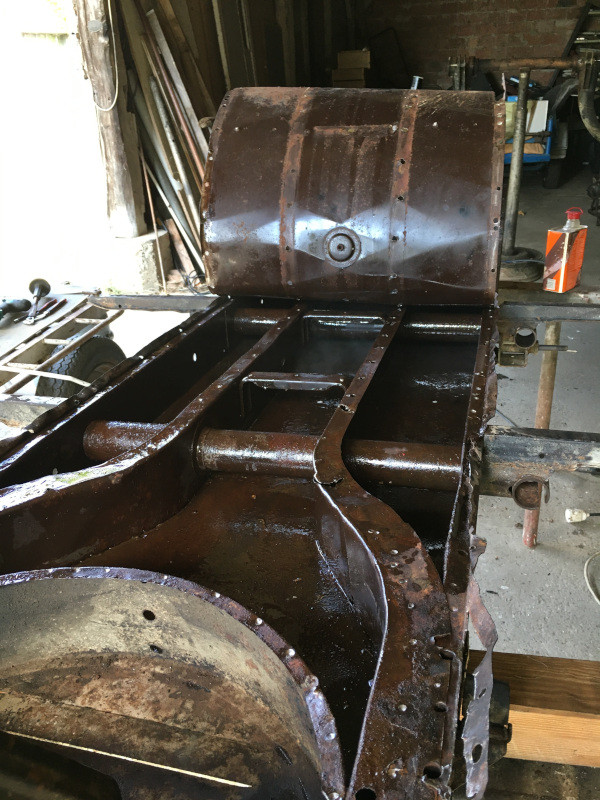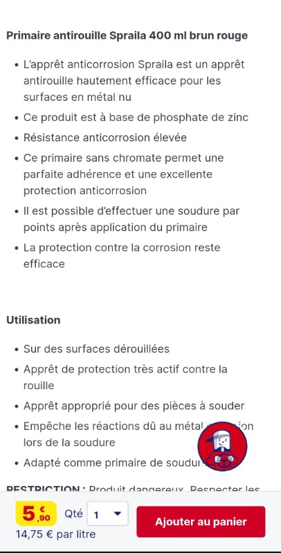 Le châssis, une fois remis en forme et la tôle soudée sera enduit de deux couches de FEROSE avant un apprêt et une peinture noire, de type industriel.. Mais ce sera après que j'aie reçu mon poste MIG que le vendeur doit venir m'apporter chez moi à l'occasion d'un déplacement professionnel.