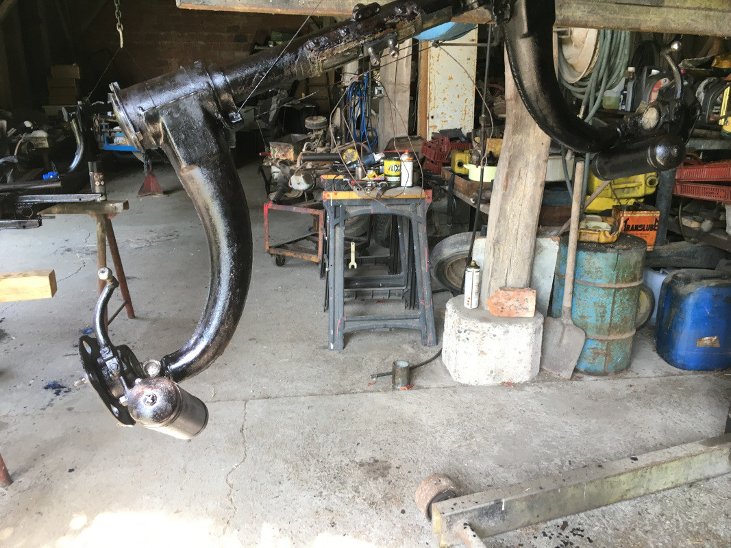 Ce matin, déshabillage du châssis, dépose des trains avant et arrière, grattage des adhésifs de caisse, enlèvement des écrous et vis cassés lors de la dépose de la caisse.