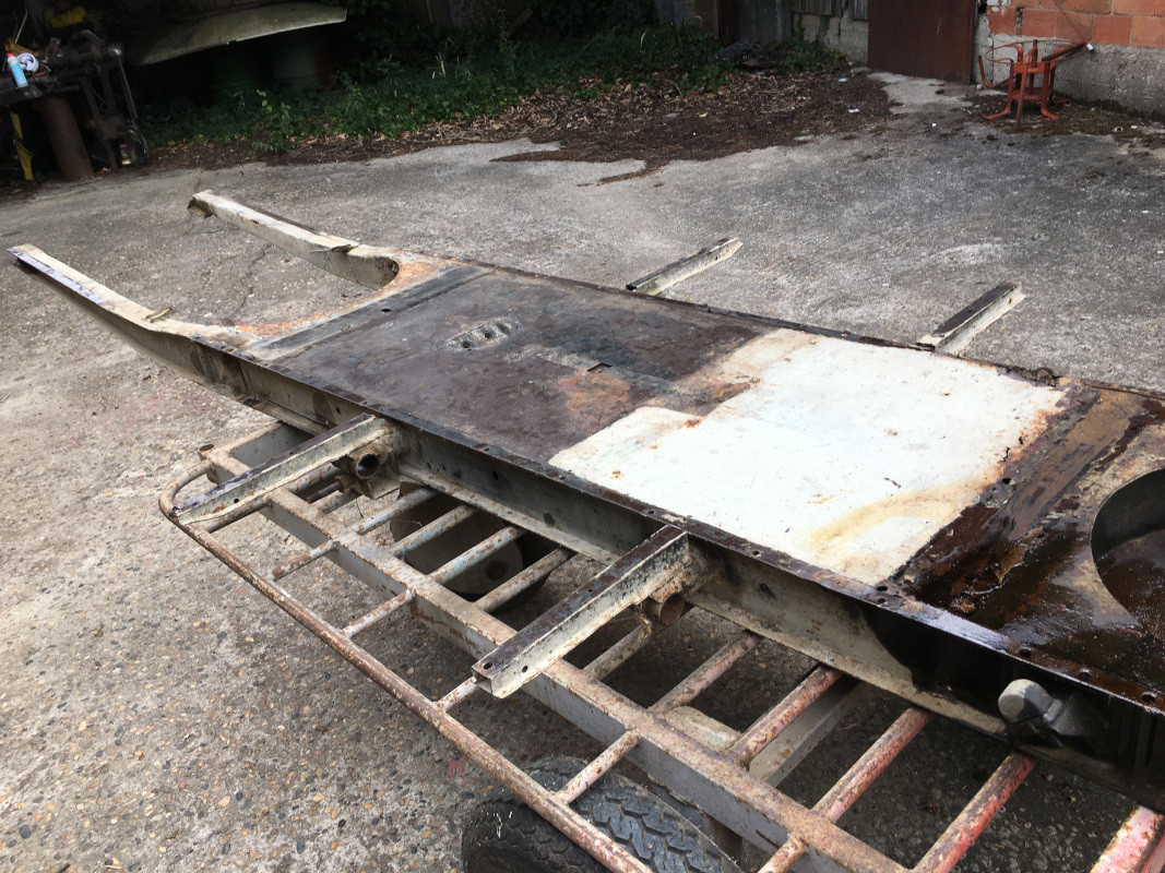 Ce matin, déshabillage du châssis, dépose des trains avant et arrière, grattage des adhésifs de caisse, enlèvement des écrous et vis cassés lors de la dépose de la caisse.