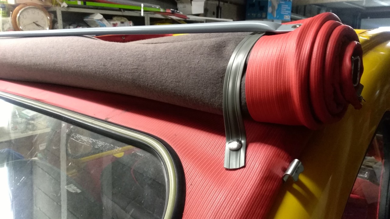 Je lance un nouveau sujet afin de ne pas polluer tous les autres sujets déjà bien remplis. J'ai reçu ce matin mon colis avec le système d'ouverture de capote intérieure à monter sur ma capote à ouverture extérieure. J'ai donc le portique avec ses attaches déja fixées, 2 sangles en plastiques equipées de boutons pressions, une sangle centrale avec un bouton pressions et 2 petits trous ( je ne sais pas à quoi ils servent d'ailleurs?), 7 boutons pressions à installer, et les 2 crochets pour le devant afin de fixer l'ensemble.