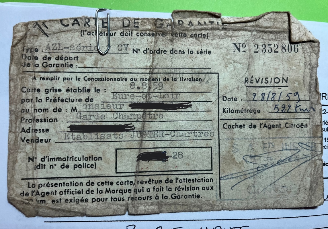 Vous verrez sur les 2 documents que je fais suivre, la carte grise et la carte de garantie Citroën, que je peux avoir un doute. Est-ce une AZ ? Une AZL ? J'exclue l'AZLP puisque rien n'y correspond. J'ai bien noté que l'abréviation SIE apparaissant sur la carte grise signifie "série", c'est donc une série 2 chevaux !!