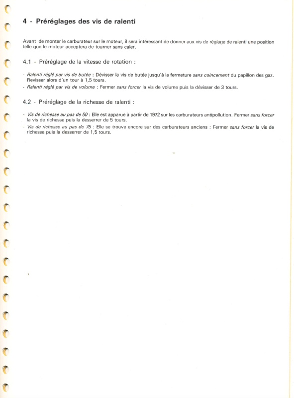 PS 3 : la position de départ du réglage d'une vis de débit de ralenti, sur un pas de 75, est après serrage complet, de desserrer de 1,5 tour